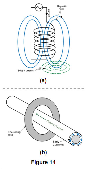 Eddy Current Testing uses the fact that when a an alternating current coil induces an electromagnetic field into a conductive test piece, a small current is created around the magnetic flux field, much like a magnetic field is generated around an electric current. The flow pattern of this secondary current, called an "eddy" current, will be affected when it encounters a discontinuity in the test piece, and the change in the eddy current density can be detected and used to characterize the discontinuity causing that change. A simplified schematic of eddy currents generated by an alternating current coil ("probe") is shown in Figure 14-a. By varying the type of coil, this test method can be applied to flat surfaces or tubular products. This technique works best on smooth surfaces and has limited penetration, usually less than ¼".